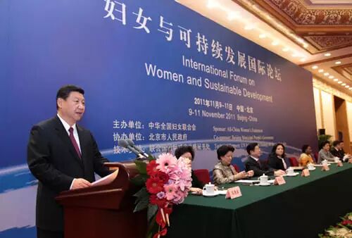圖為:2011年11月9日,中共中央政治局常委、國家副主席習近平在北京人民大會堂出席婦女與可持續發展國際論壇開幕式並致辭。