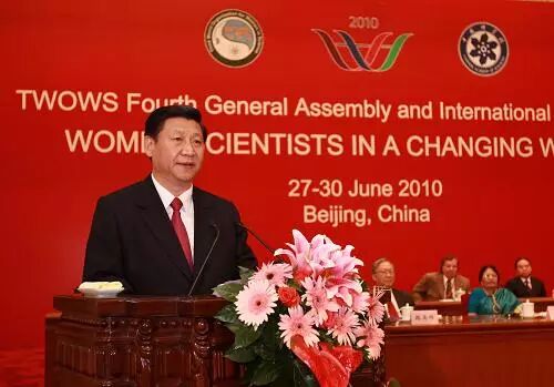 圖為:2010年6月27日,第三世界婦女科學組織第四屆大會在北京人民大會堂開幕。國家副主席習近平出席開幕式並致辭。