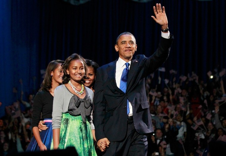 在成功連任成定局後,伊利諾伊州芝加哥市麥科米爾會展中心,歡呼聲中,奧巴馬在妻子米歇爾、女兒馬莉婭和薩沙陪同下登上舞台。