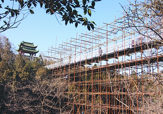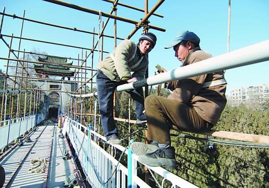 經過40名施工人員7天的緊張施工,長100米、寬2.8米、重約30噸的市人民公園新懸索橋1月13日安裝完畢。雖然周圍的腳手架還沒有拆除,但遠遠望去藍白灰三色相間的橋體還是吸引了許多市民的注意。